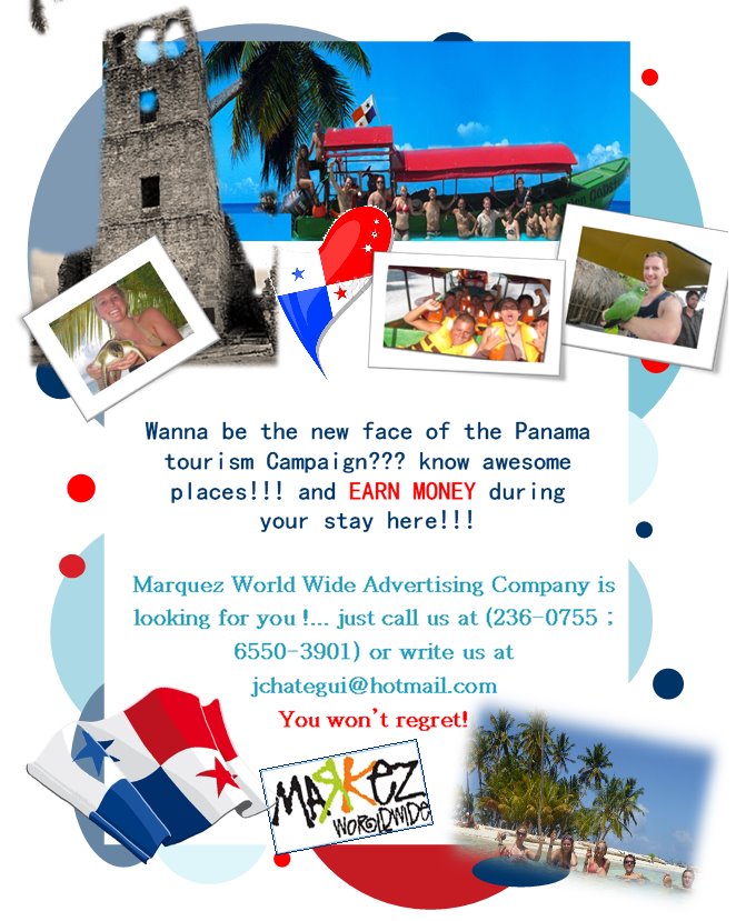 The whole opportunity was too good to be true, so I didn’t mention it to many people before it happened in case it did not turn out the way I thought. A couple weeks ago they were promoting a tourism campaign with Markez World Wide http://www.blogger.com/post-create.g?blogID=3604174840679045883and I heard about it though one of the AIESECers, on the facebook page (totally legit right?). They were looking for “European looking” people to help promote Panama as a tourist destination. I didn´t believe it but that little voice in the back of my head was like “hmm, what if it is that easy?” So I started doing research. I talked to the guy who supposedly knew the people from the agency. I checked with some other AIESECers to make sure they knew the guy and the agency. I researched them online. When I finally found a news article about how the agency had won this contract from the government, I decided it was legit and that I would not be kidnapped and sold into sex slavery.